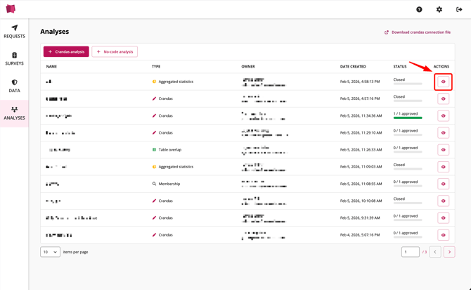 2. Click on the 'View' button (eye icon) for the analysis you wish to delete.