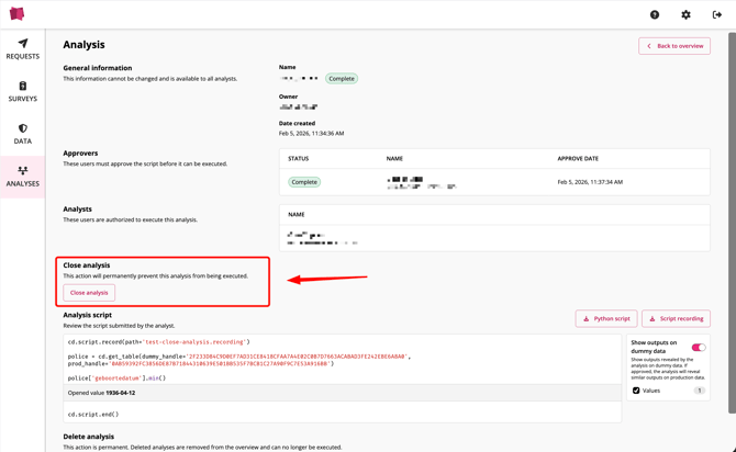 You can close an analysis to prevent further execution while keeping the record in your overview.