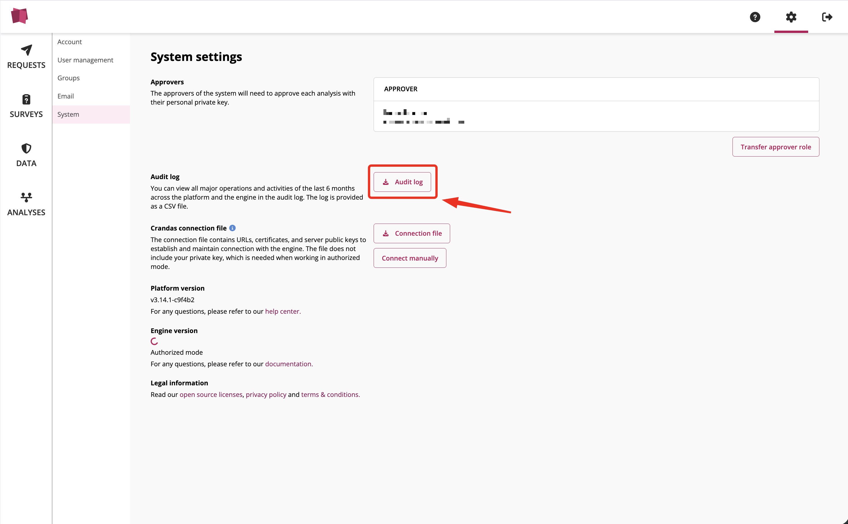 Downloading the audit log allows you to review a complete record of actions taken within the system. Note that due to the sensitive nature of this data, strictly limited permissions apply.