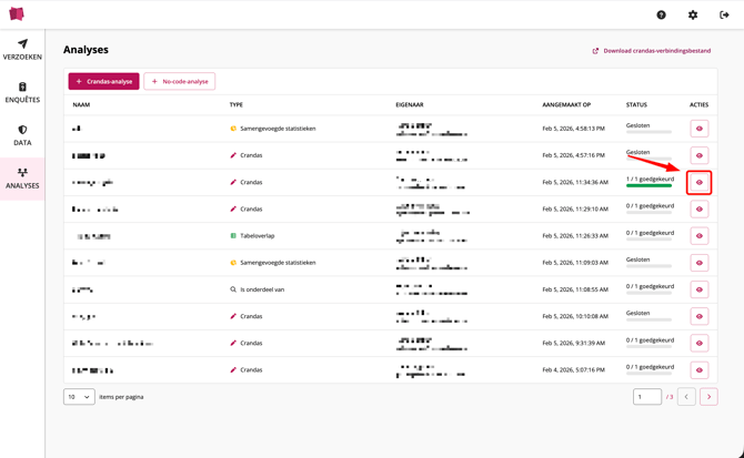 - Klik op de knop ‘Bekijken’ (oogpictogram) voor de analyse die u wilt verwijderen.