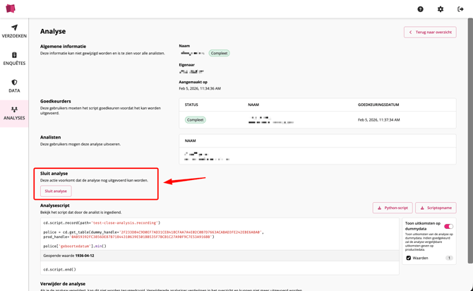 - Een analyse sluiten: De analyse blijft in het overzicht staan, maar kan niet meer worden uitgevoerd.