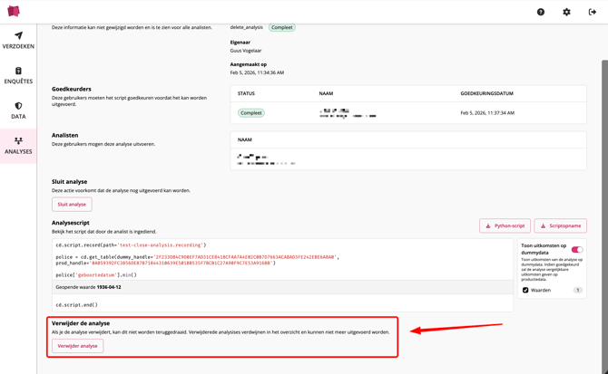 Als je een analyse verwijdert, wordt deze gesloten en helemaal uit het overzicht gehaald. Hij blijft alleen nog in het auditlogboek staan.