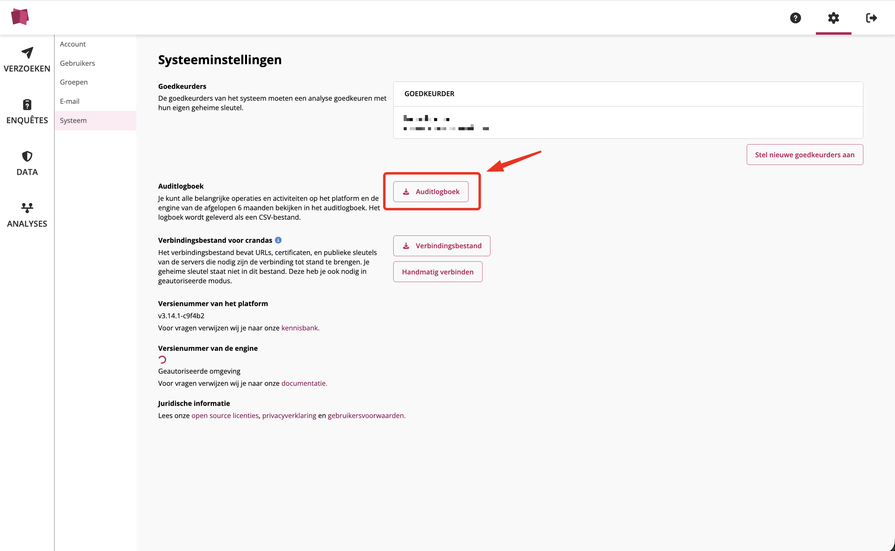 U moet de rol van beheerder hebben om het auditlogboek te kunnen downloaden. Als u de onderstaande opties niet ziet, neem dan contact op met de beheerder van uw omgeving.