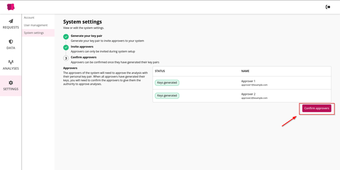 6. Bevestig de goedkeurders door op "Goedkeurders bevestigen" te klikken en onderteken dit met de geheime sleutel die je hebt gedownload.